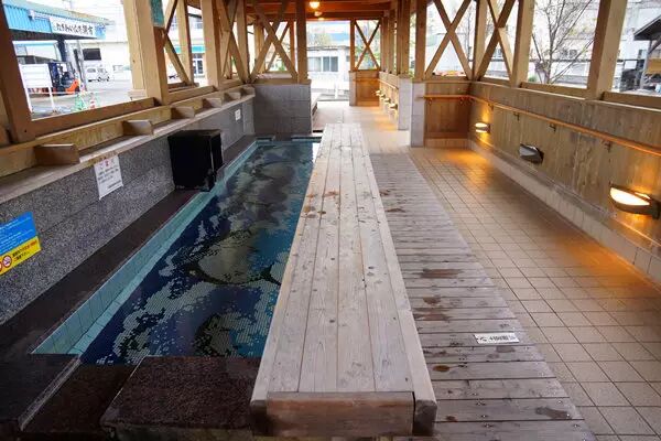 这里温泉资源极为丰富,几乎每家旅馆都有温泉浴室。而从小镇任何一个角落——码头、火车站、商店街——都常常能见到这样的敞开式路边温泉。下面这座,就位于渔港码头边,规模颇大。不仅有泡手的水池,还有可以脱鞋坐下来泡脚的地方。天寒地冻的日子里,走着走着如果感觉冻坏了,就能随时在路边泡会儿温泉,手脚热乎起来之后又能继续上路啦。