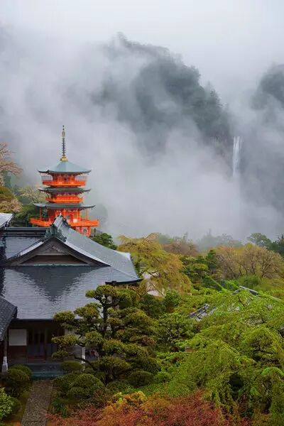 远处是日本第一瀑布——那智瀑布,落差133米。从那智大社可以看到瀑布挂在山间的美景,云雾缭绕,如同仙境。